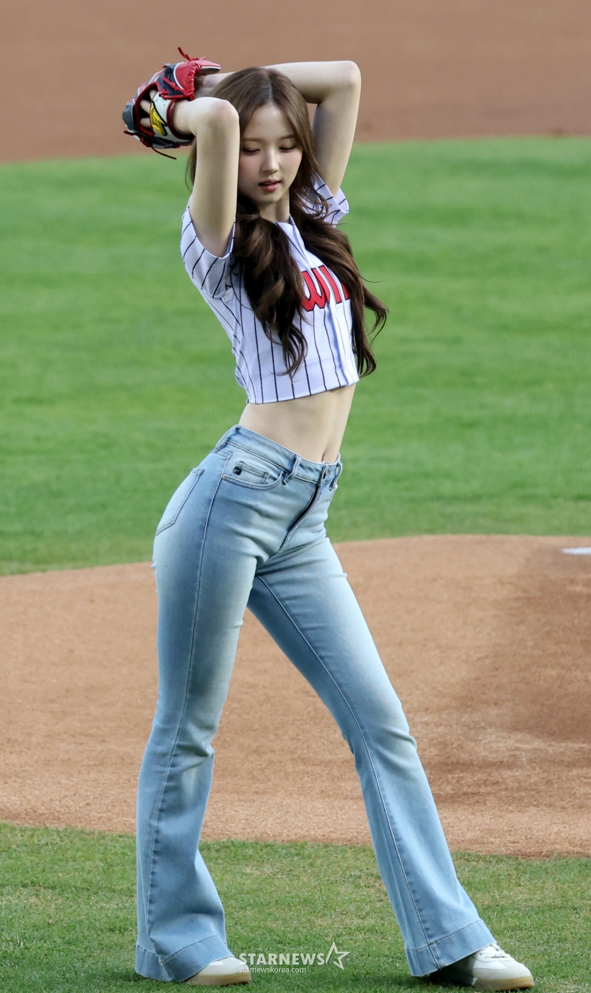 グループトリプルエス(tripleS)メンバーのイ·ジウがLG勝利祈願の始球式をしている。 試打はチョン·ハヨンが担当した。