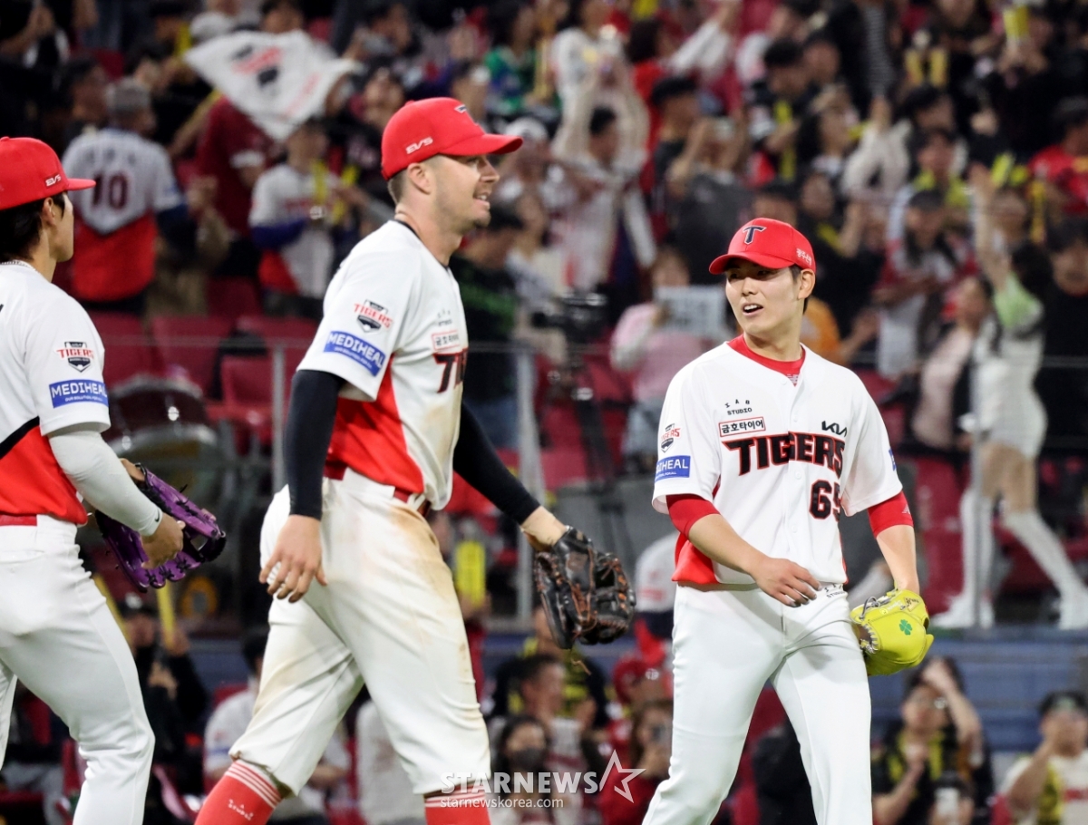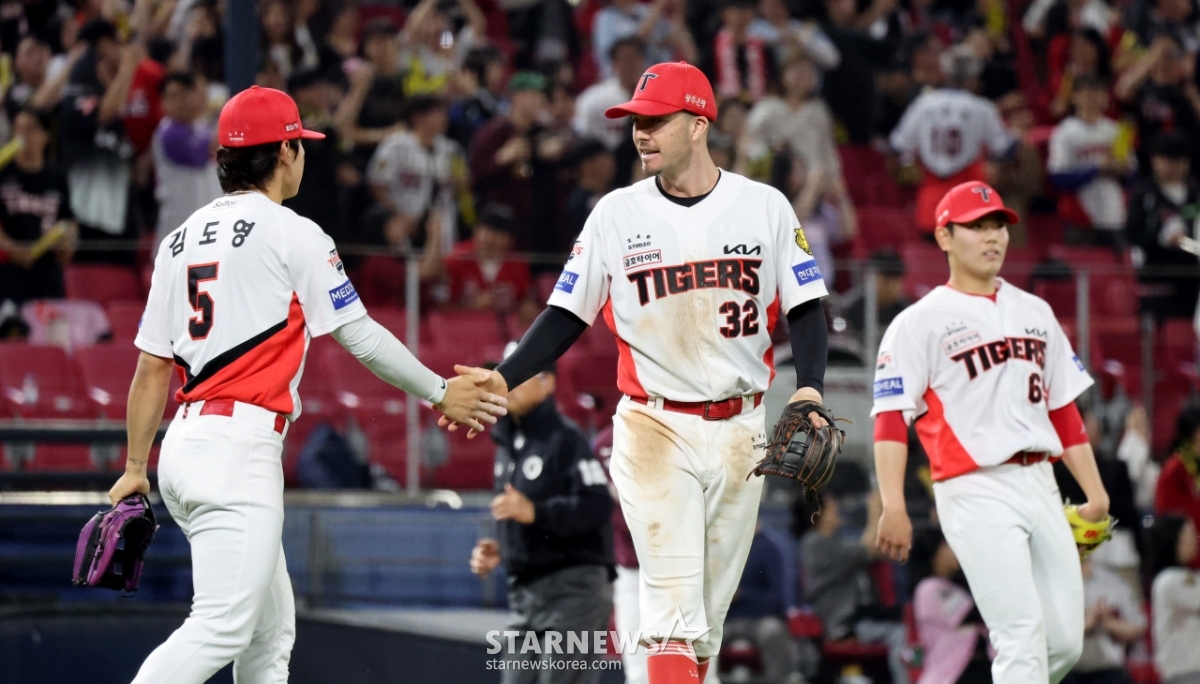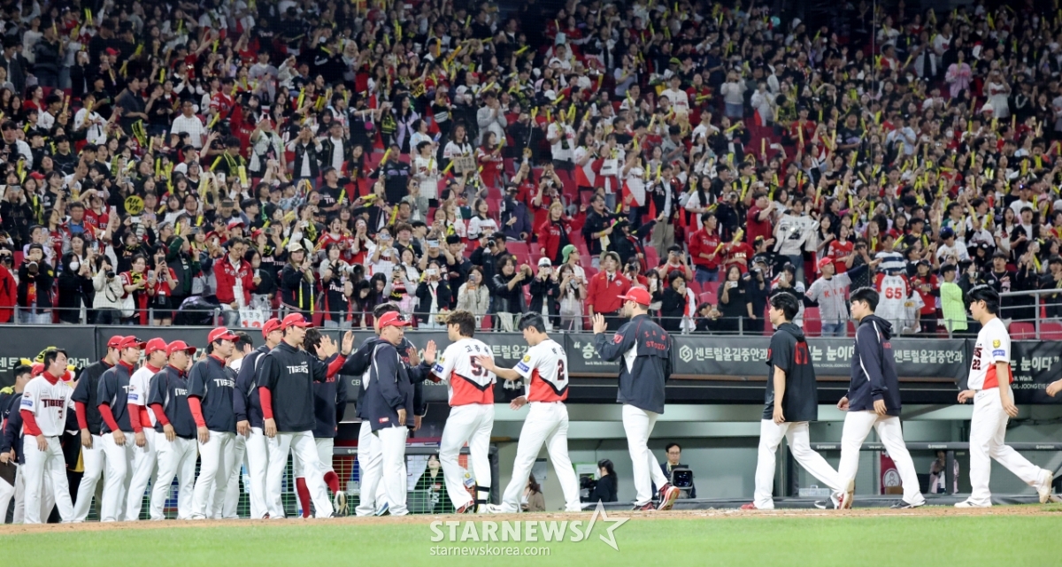 起亜(キア)選手たちが16日、光州(クァンジュ)KIAチャンピオンズフィールドで行われた2026KBOリーグ·起亜タイガースとキウムヒーローズの試合で5-1で逆転勝ちした後、ファンに挨拶をしながら祝っている。