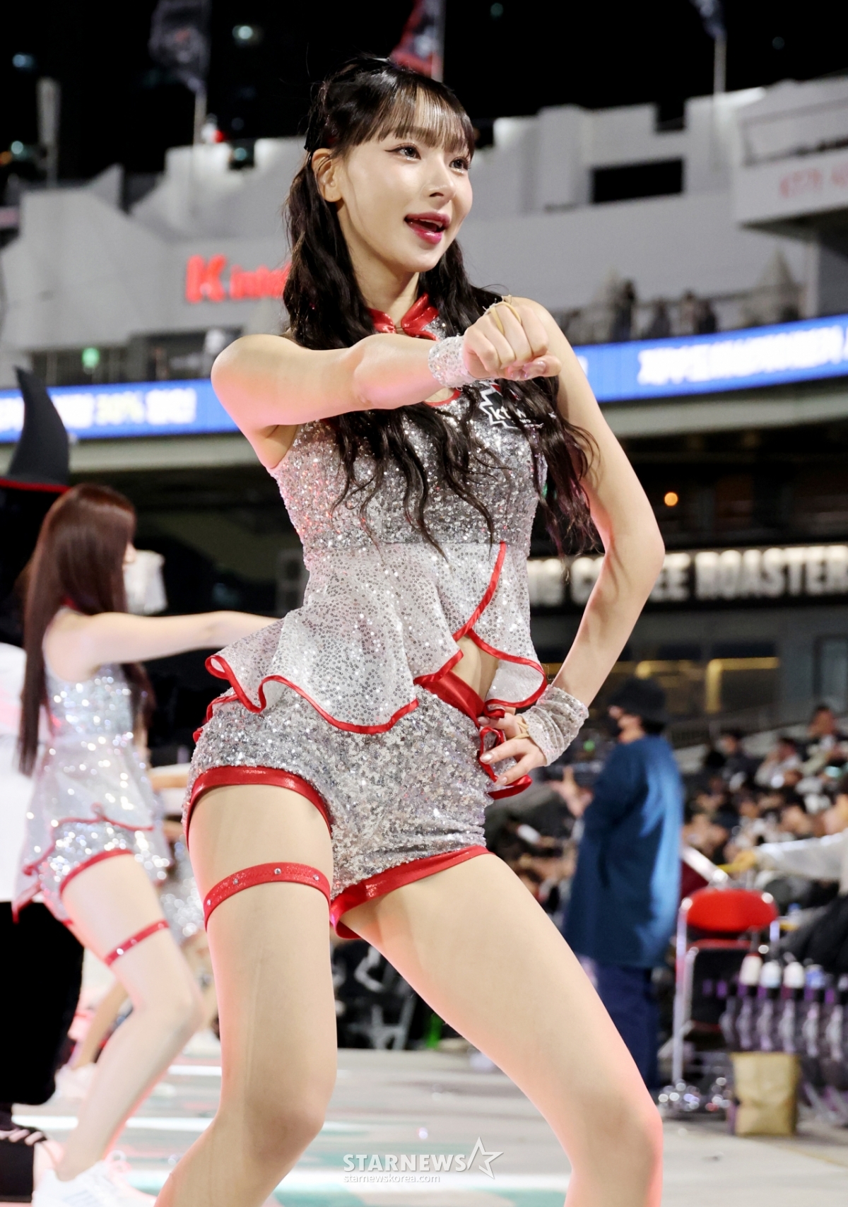 KTチアリーダーのチョン·ヒジョンが17日、水原KTウィズパークで開かれた2026KBOリーグKTウィズとキウムヒーローズの試合で、連続でアウトソングダンスを披露している。 2026.04.17.