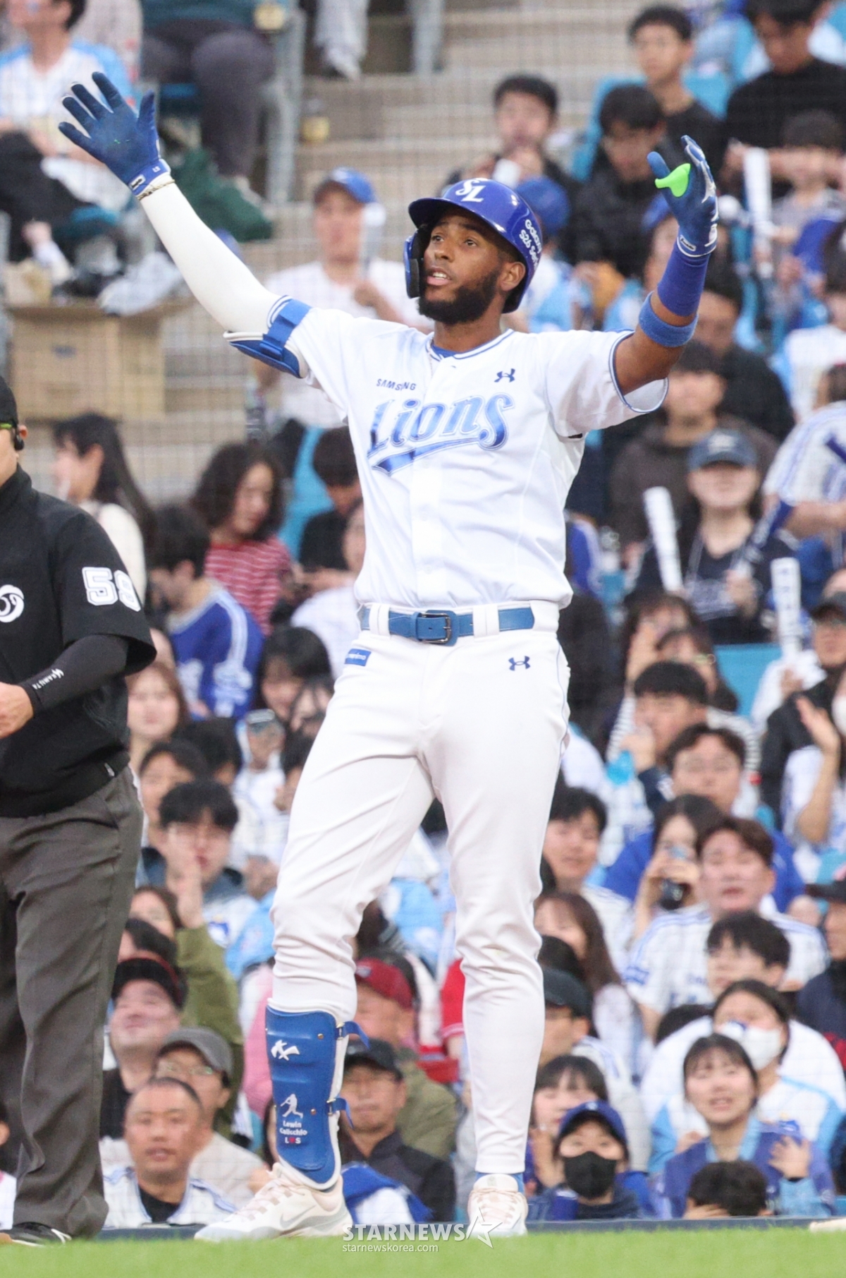 三星(サムスン)ディアスが1回裏2死1塁で左前安打を放って出塁した後、セレモニーをしている。