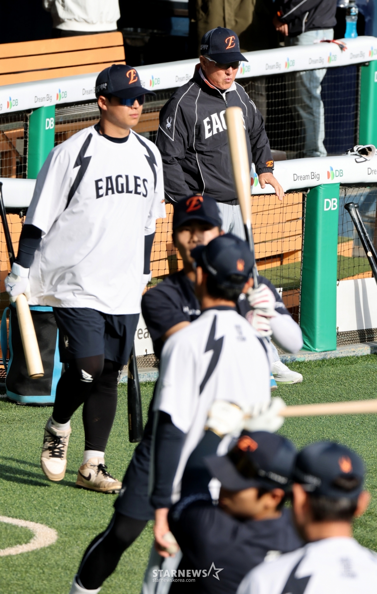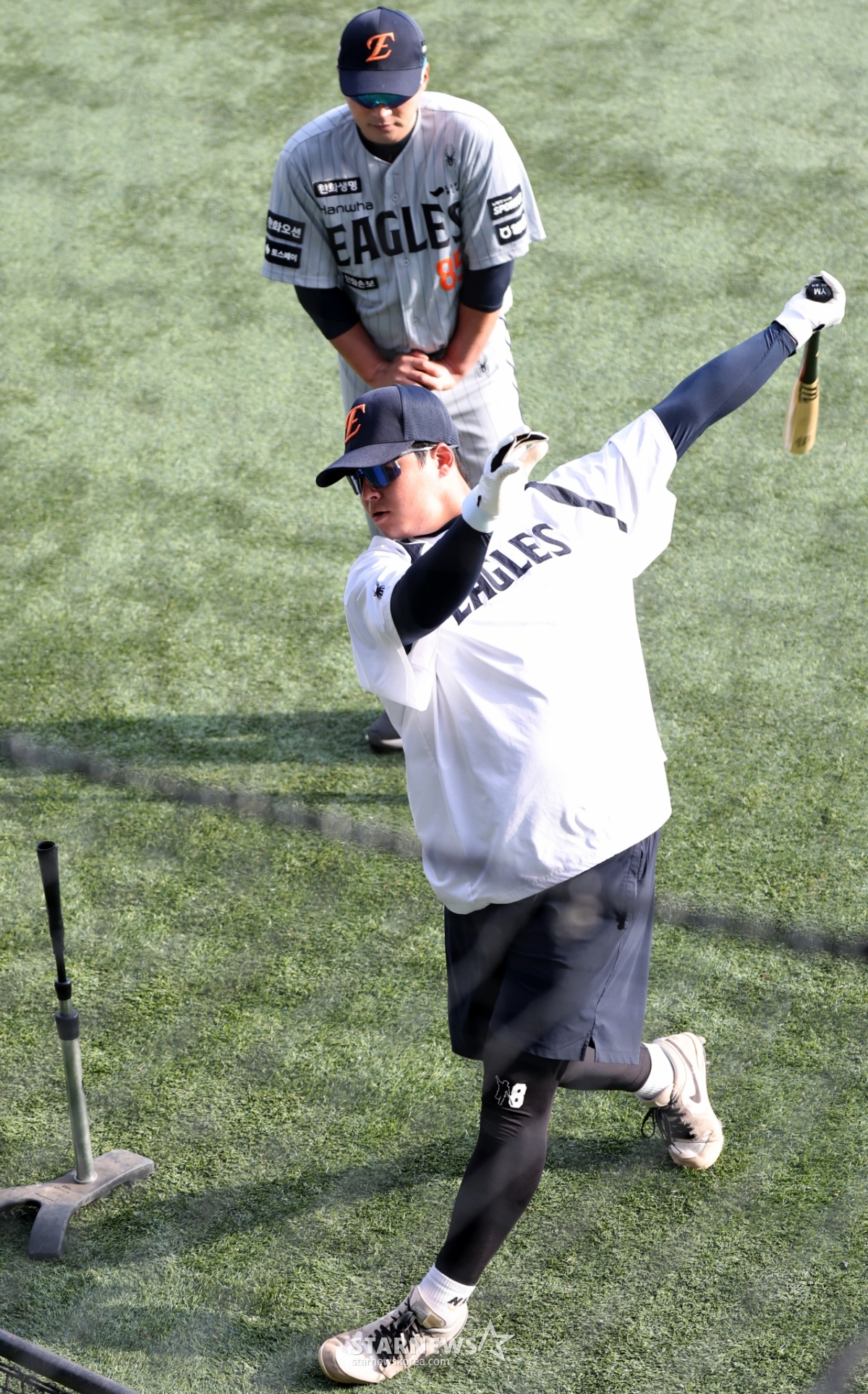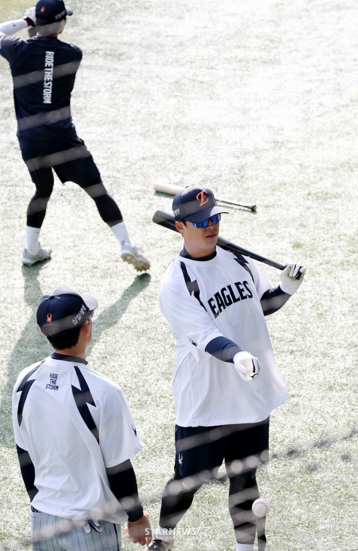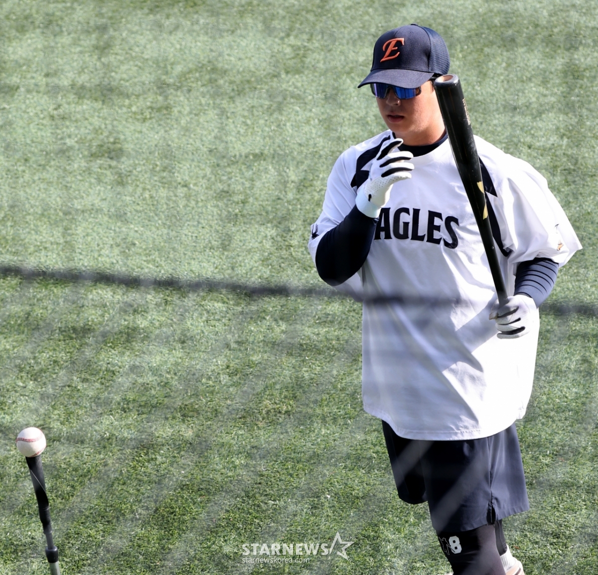 打撃不振で登録が抹消されたハンファのノ·シファンが22日、蚕室(チャムシル)野球場で行われる2026KBOリーグのLGツインズとハンファイーグルスの試合を控え、打撃練習のためグラウンドに出ている。