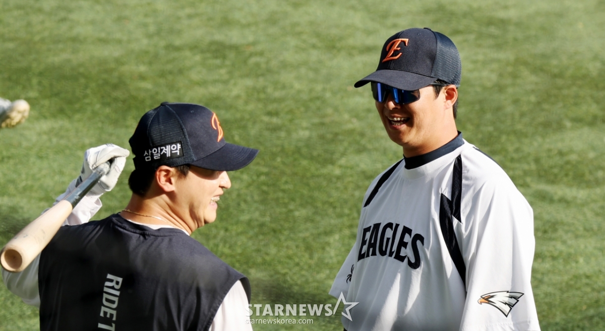 ハンファの柳賢振(リュ·ヒョンジン)が22日、蚕室(チャムシル)野球場で行われる2026KBOリーグのLGツインズとハンファ·イーグルスの試合を控え、打撃練習中のノ·シファンとバットについて話し合っている。 2026.04.22.