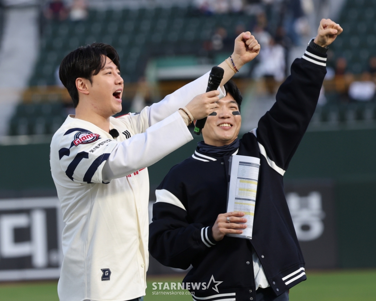 トロット歌手のカン·ソルミンがロッテの勝利祈願の始球式に「前史ファイト」を叫んでいる。
