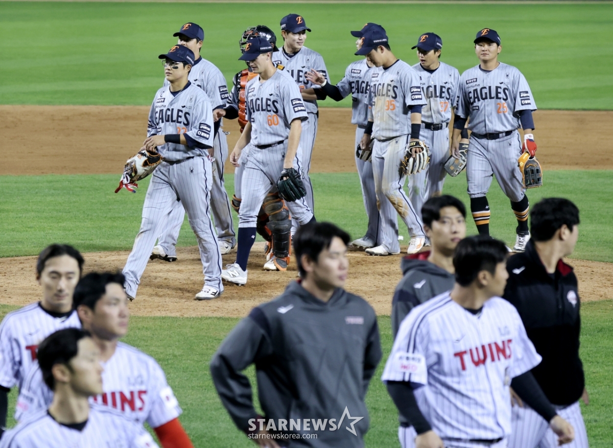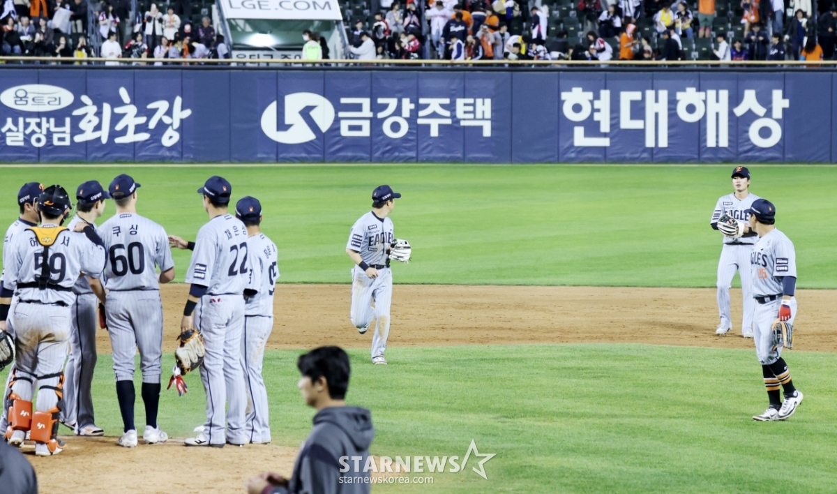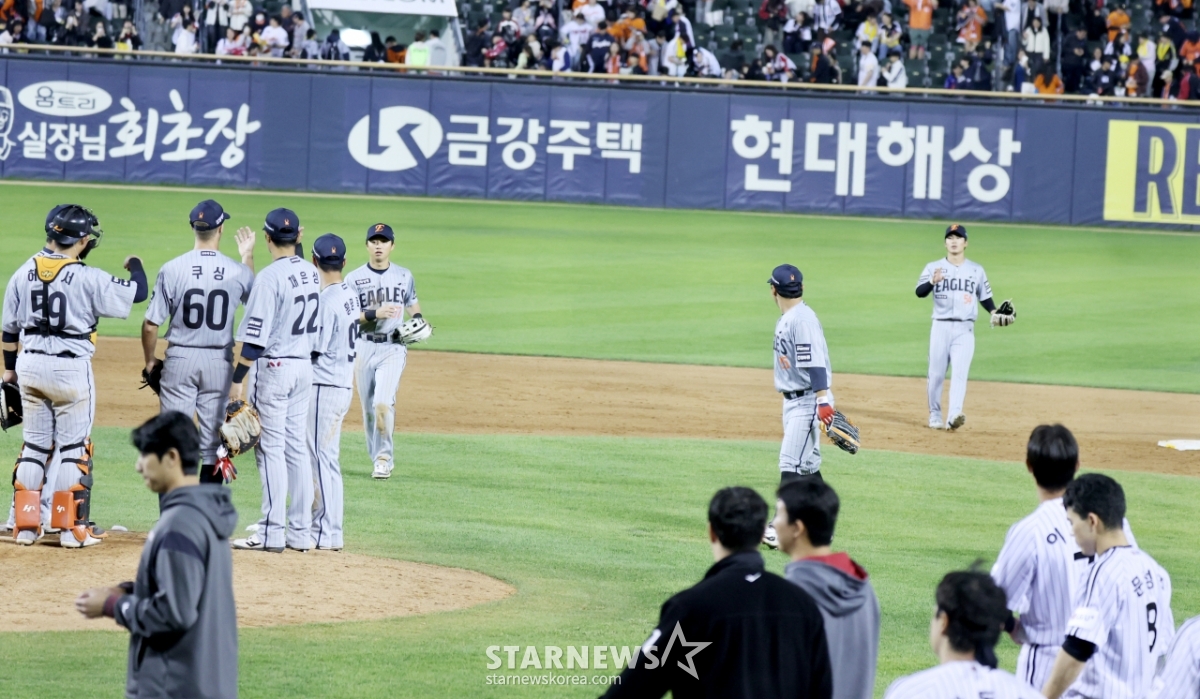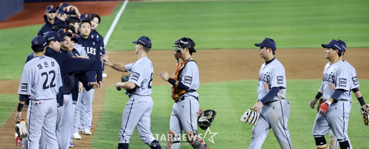 ハンファの選手たちが23日、蚕室(チャムシル)野球場で行われた2026KBOリーグLGツインズとハンファイーグルスの試合で勝利し、2連敗を脱出した後、祝っている。 2026.04.23.