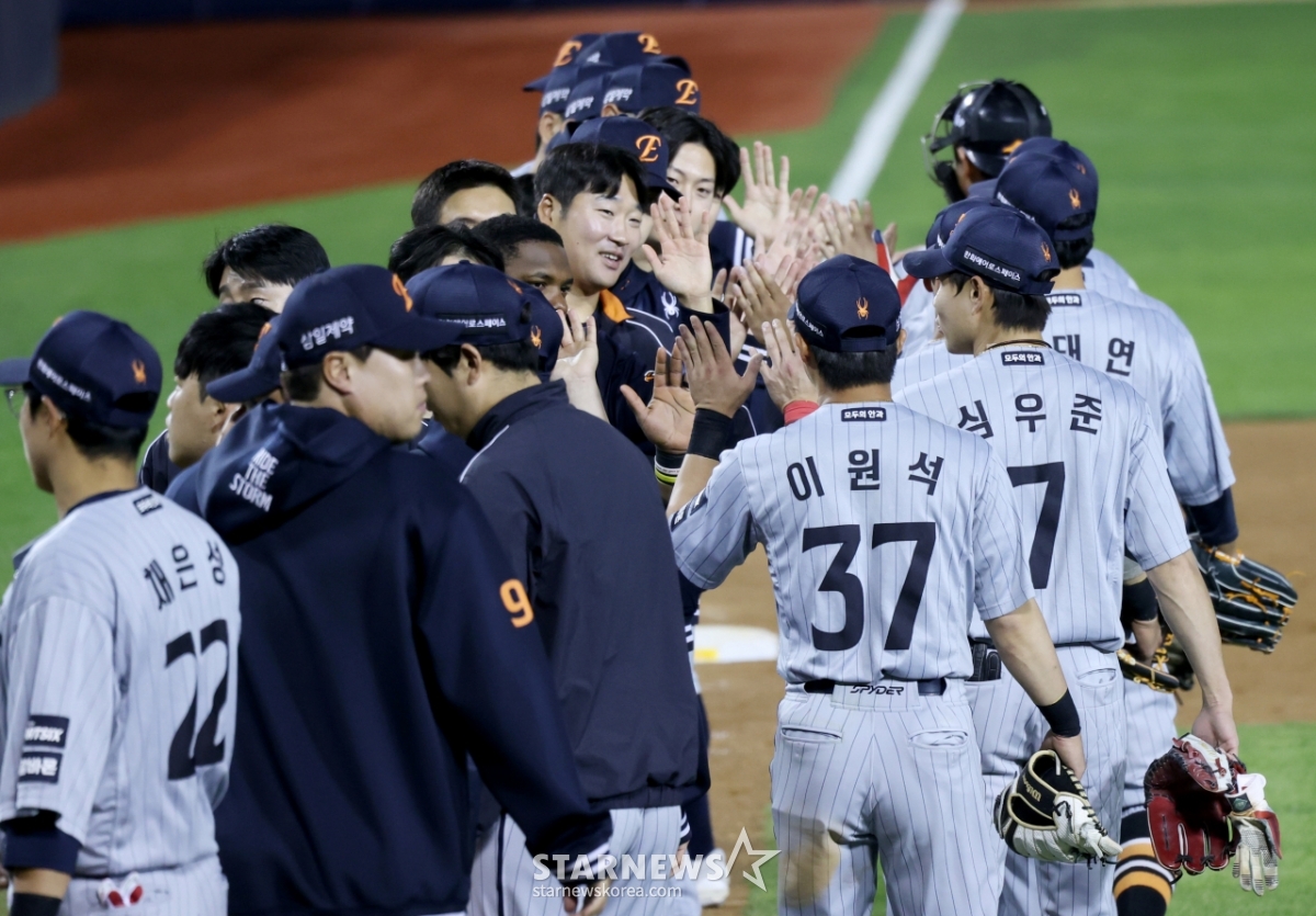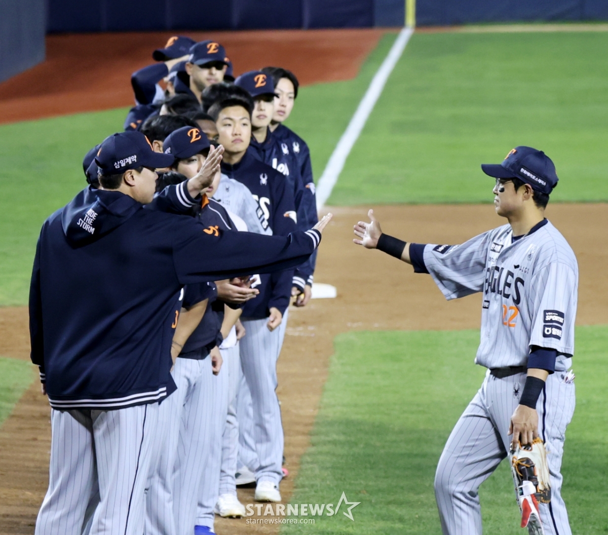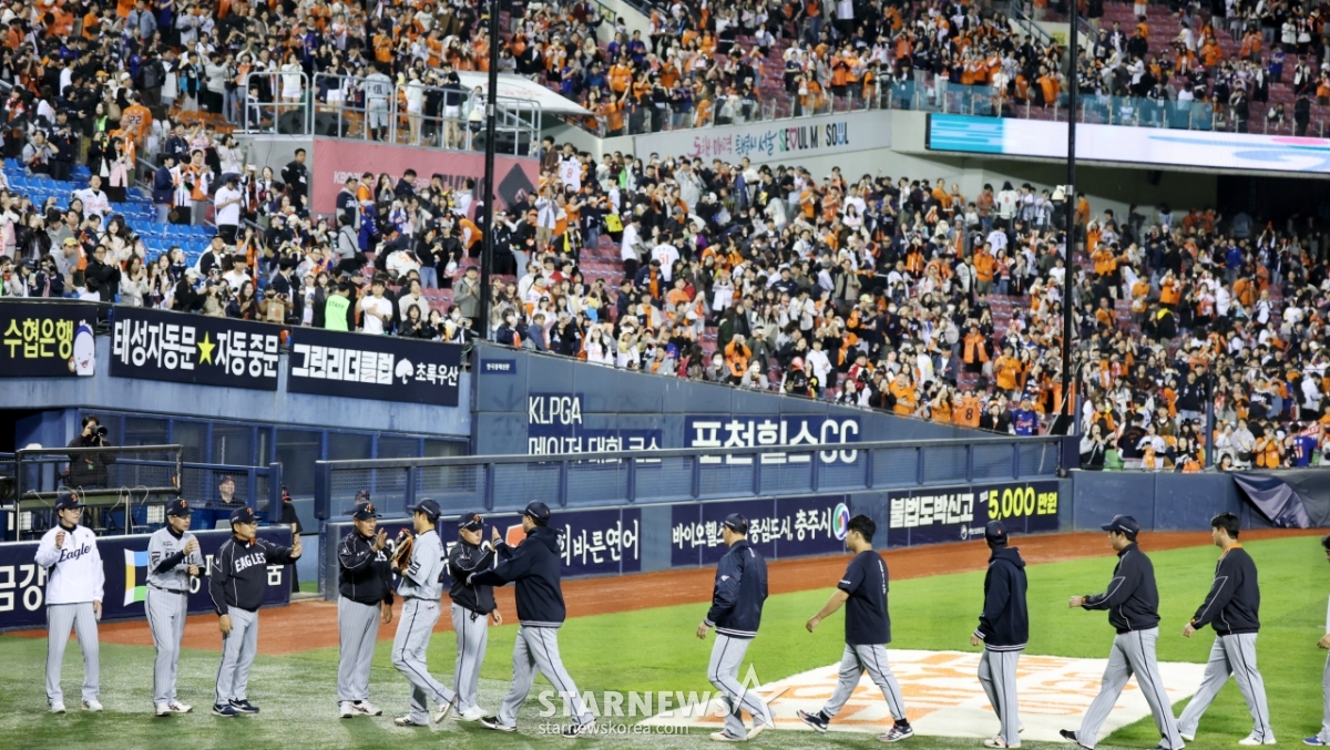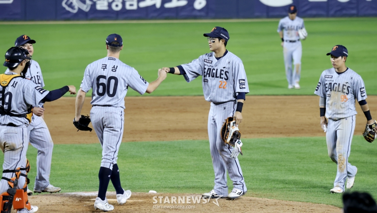 ハンファの選手たちが23日、蚕室(チャムシル)野球場で行われた2026KBOリーグLGツインズとハンファイーグルスの試合で勝利し、2連敗を脱出した後、祝っている。 2026.04.23.