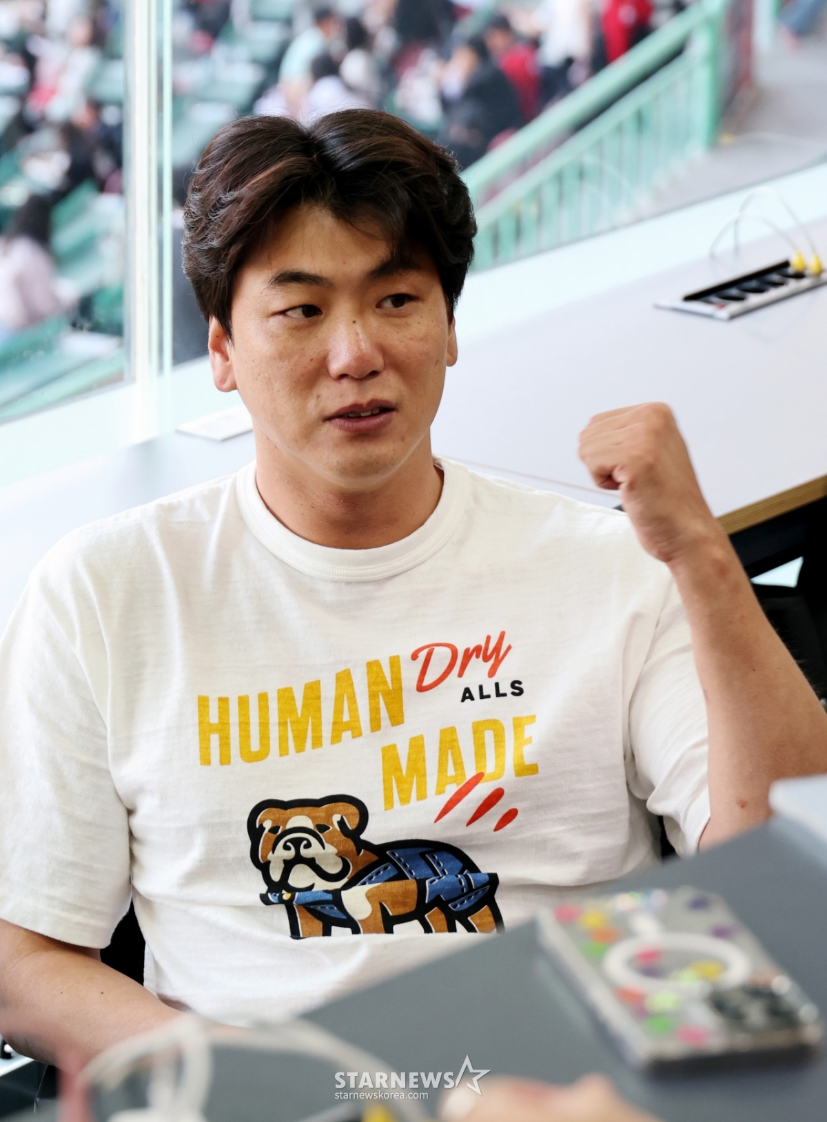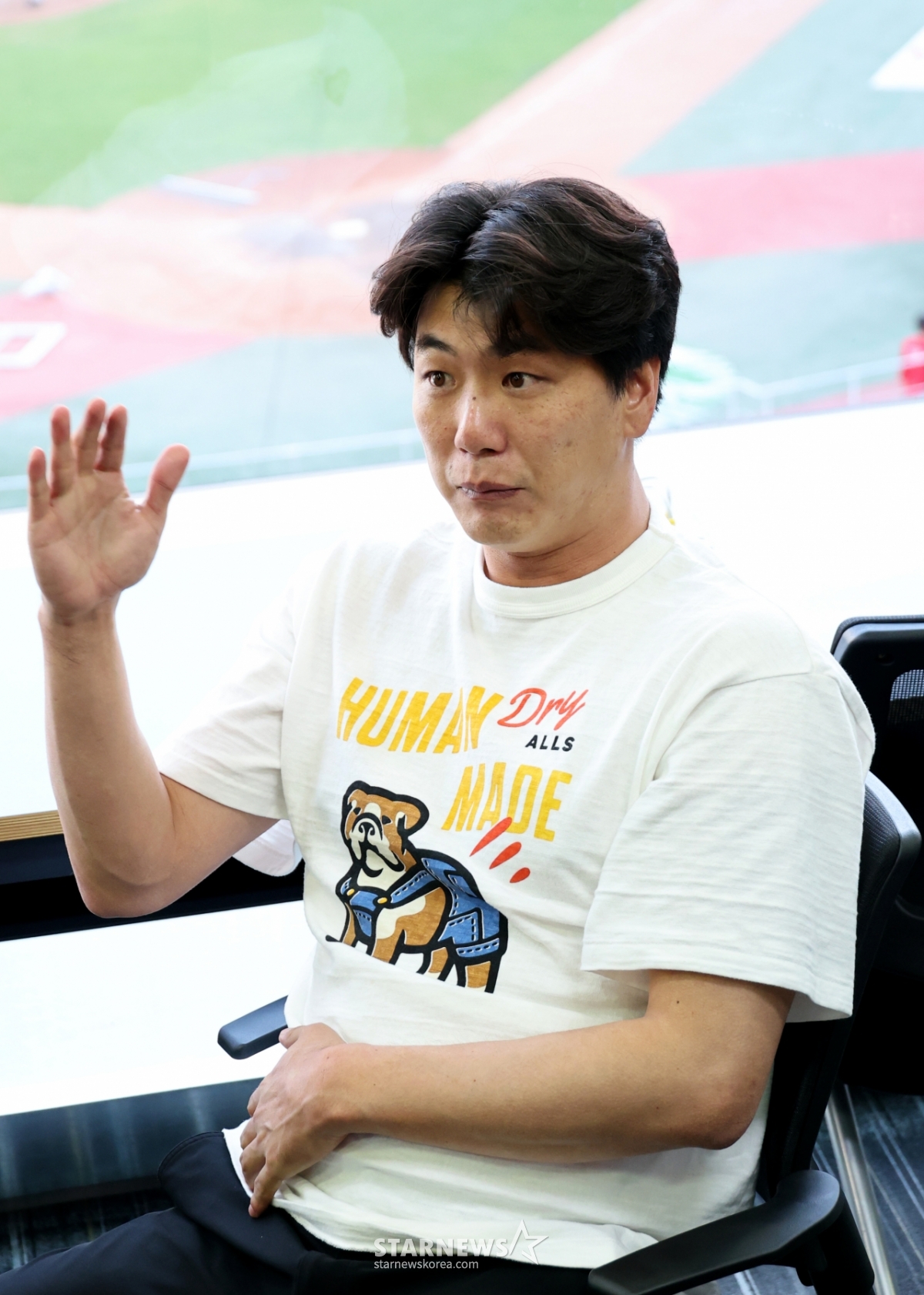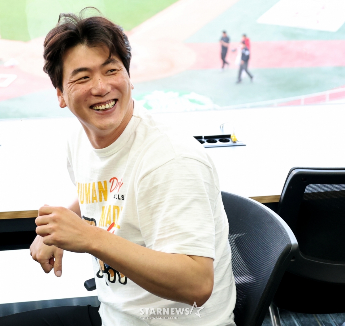 肩の上に伸びた骨を切り取ってリハビリが進行中の金広鉉が、24日に開かれる2026KBOリーグSSGランダースとKTウィズの試合に先立って記者室を訪れ、手術経過など体調について記者たちと話を交わしている。 2026.04.24.