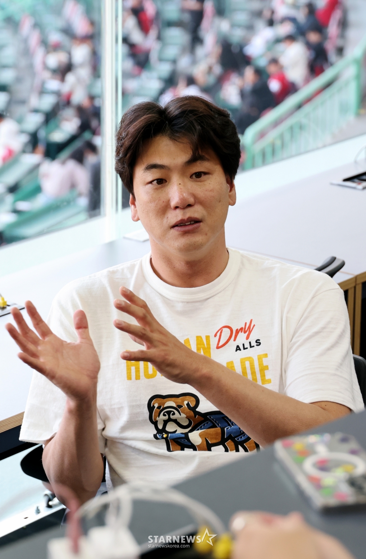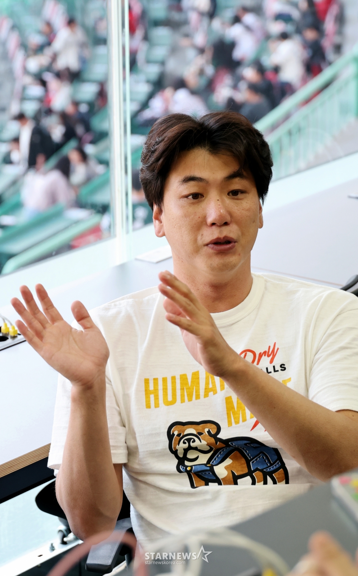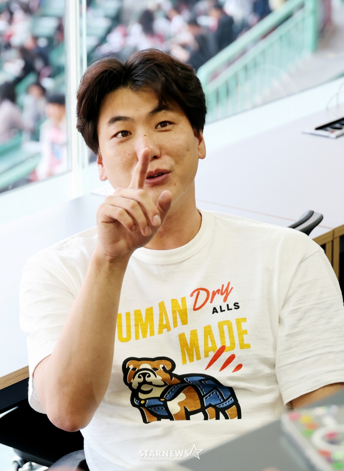 肩の上に伸びた骨を切り取ってリハビリが進行中の金広鉉が、24日に開かれる2026KBOリーグSSGランダースとKTウィズの試合に先立って記者室を訪れ、手術経過など体調について記者たちと話を交わしている。 2026.04.24.