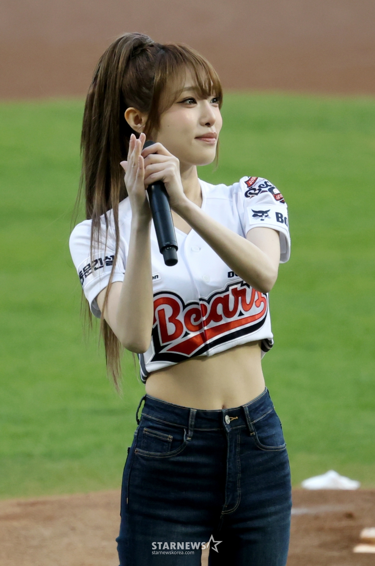 歌手のチェ·イェナ(YENA)が斗山(トゥサン)の勝利祈願の始球式をしている。