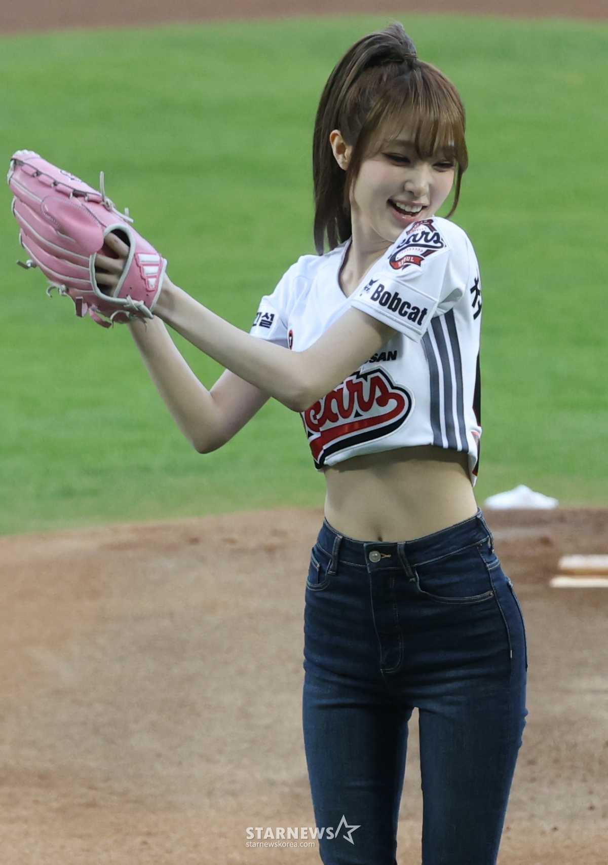 歌手のチェ·イェナ(YENA)が斗山(トゥサン)の勝利祈願の始球式をしている。