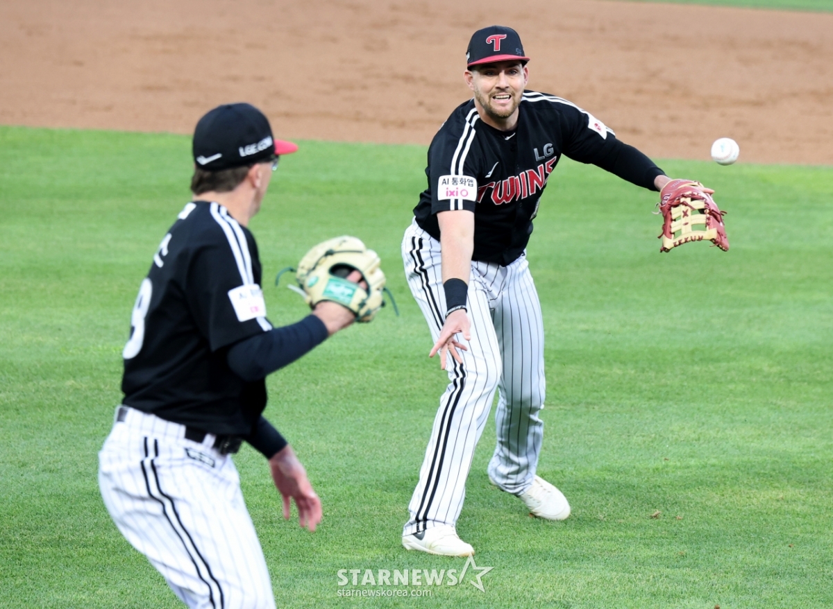 LGの左腕投手ウェルズが28日、水原KTウィズパークで行われた2026KBOリーグLGツインズとKTウィズの試合1回裏、オースティンのトスされたボールをキャッチするために1塁に向かっている。 打者走者のチェ·ウォンジュンはセーフ。 2026.04.28.