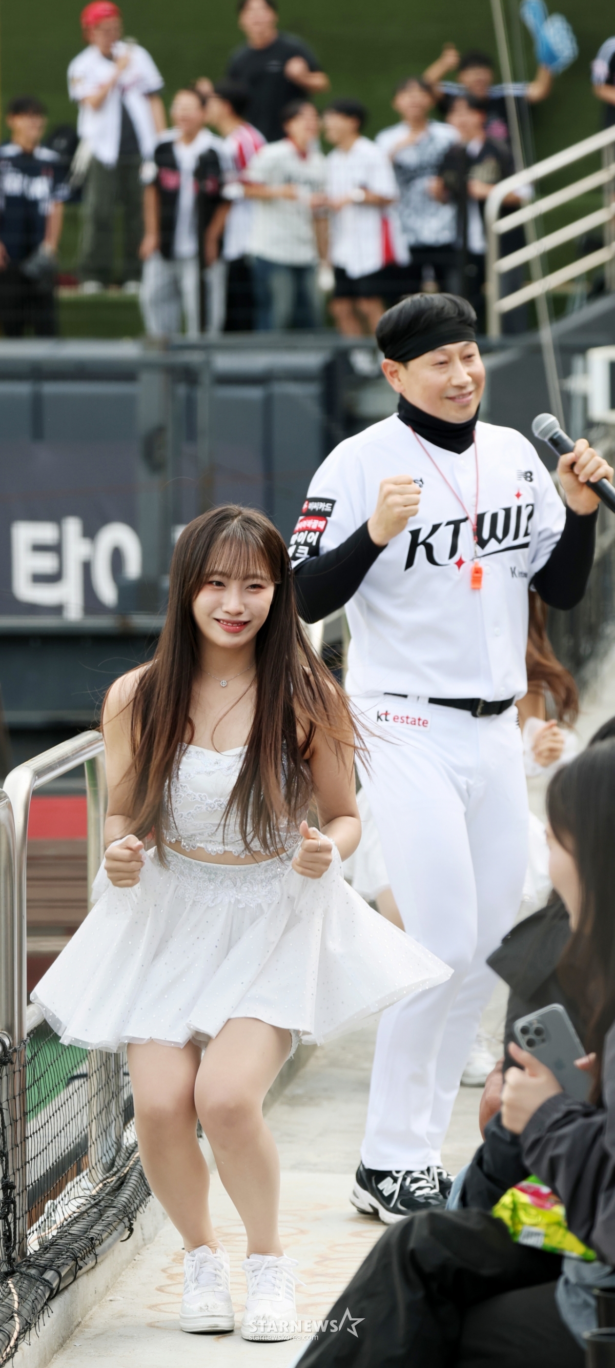 KTチアリーダーのイ·ソユンと応援団長のキム·ジュイルが29日、水原KTウィズパークで開かれた2026KBOリーグLGツインズとKTウィズの試合に先立ち、早くも野球場を訪れたファンに応援曲を紹介し、リズムを共にしている。 2026.04.29.