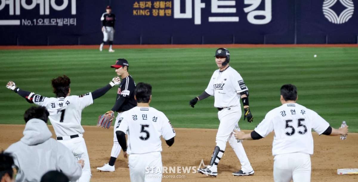 KTの4番打者チャン·ソンウが29日、水原(スウォン)KTウィズパークで行われた2026KBOリーグLGツインズとKTウィズの試合10回裏、1死満塁で左翼手を越える2塁打で試合を終えている.. 2026.04.29.