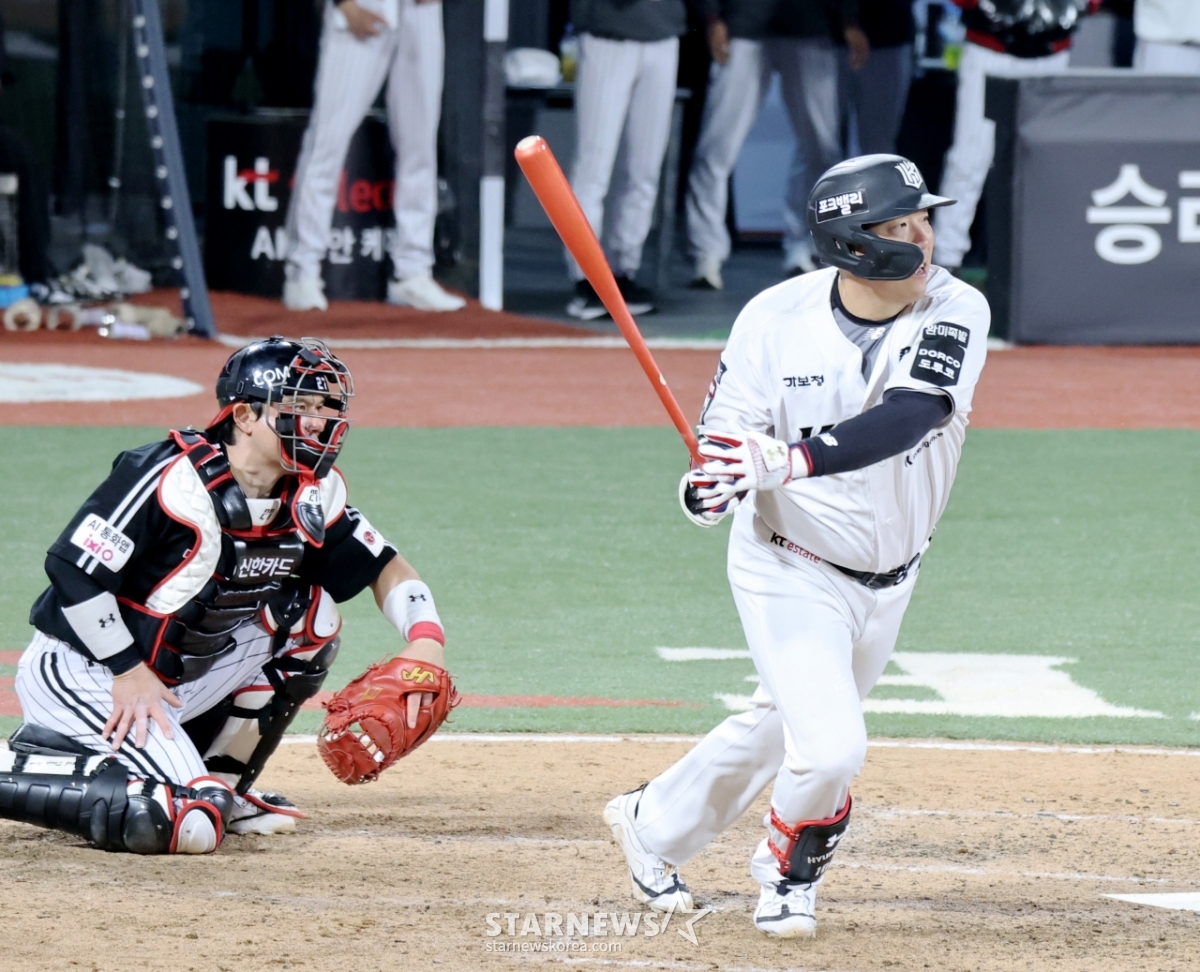 LG1塁手のムン·ボギョンが30日、水原(スウォン)KTウィズパークで行われた2026KBOリーグLGツインズとKTウィズの試合5回裏、安打で出塁した金賢洙(キム·ヒョンス)のお腹を触っている。 2026.04.30