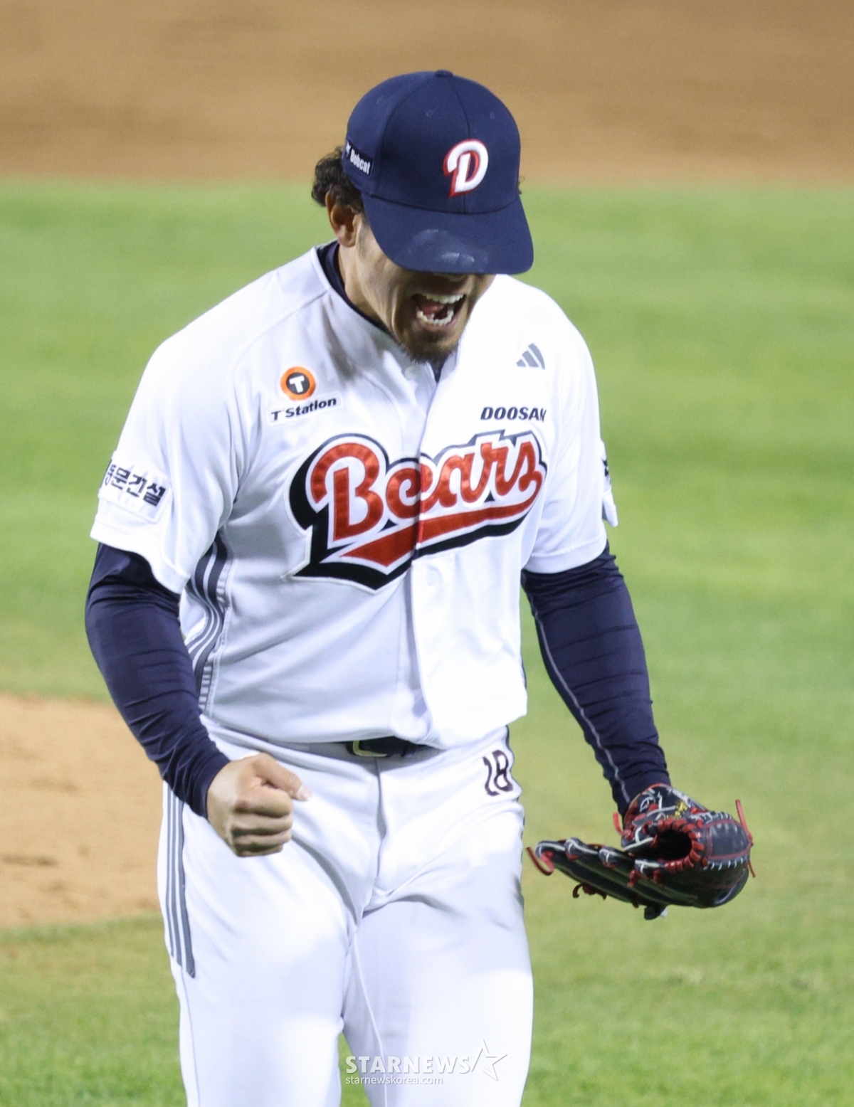 斗山の田村が5回表2死3塁で、三星のチョン·ビョンウを三振に仕留め、歓呼している。
