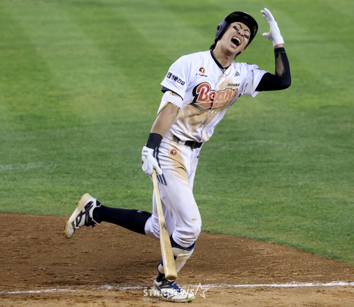 斗山(トゥサン)の金ミンソクが7回裏1死1、2塁で投げた打球がフライになると、残念がっている。