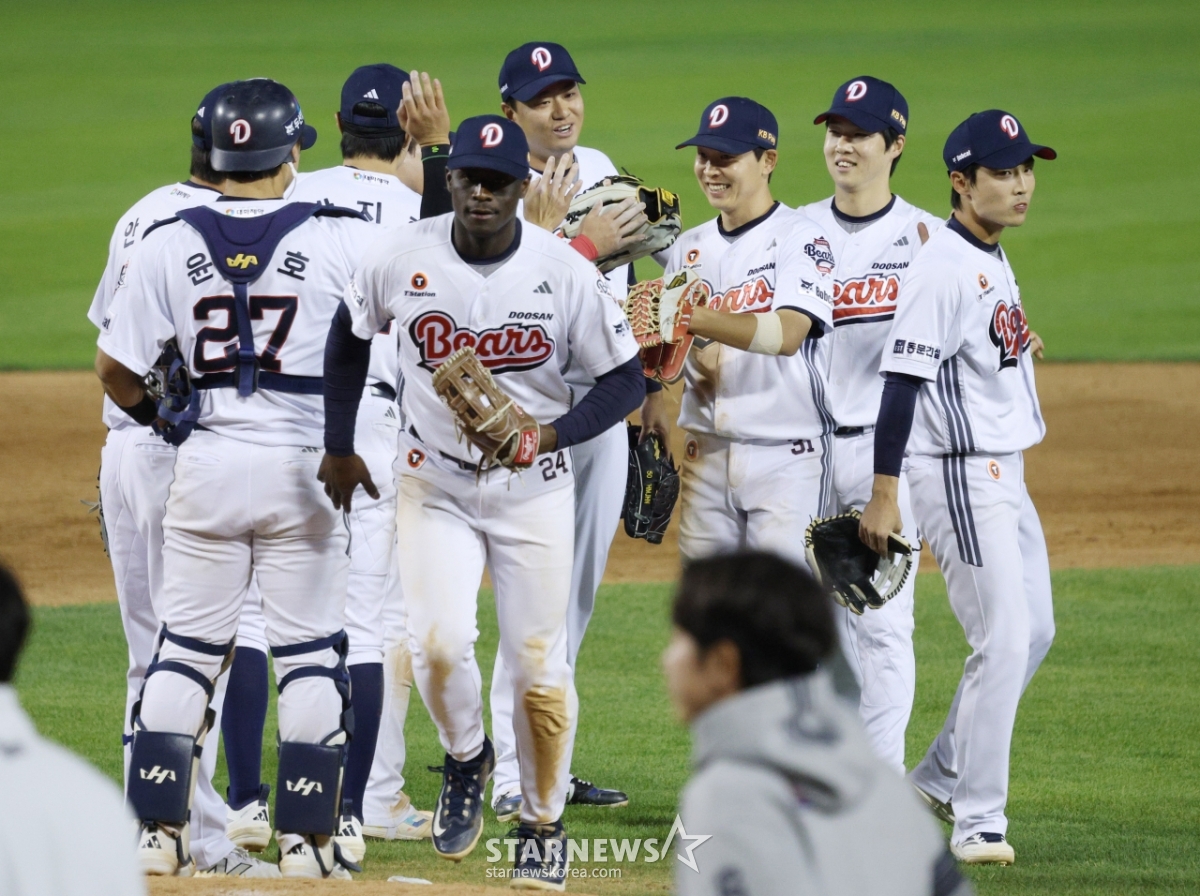 斗山(トゥサン)の選手たちが三星(サムスン)に8-5で勝利した後、喜びを分かち合っている。