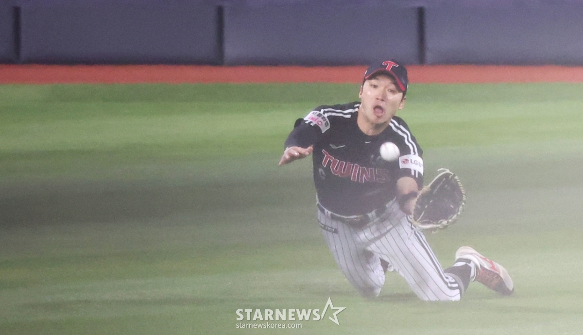 LG中堅手の朴へミンが30日、水原(スウォン)KTウィズパークで行われた2026KBOリーグLGツインズとKTウィズの試合6回裏、2死2塁の金賢洙(キム·ヒョンス)の好当たりの打球をダイビングキャッチしている。 2026.04.30