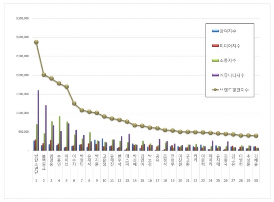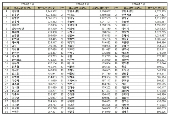 2026年3月の広告モデルブランド評判30位の順位は、BTS、ブラックピンク、イム·ヨンウン、ソン·フンミン、アイブ、イ·スジ、パク·ジョンミン、ユ·ジェソク、パク·ジフン、コ·ユンジョン,ユ·ヘジン,ビョンウソク,エスパ,パク.シネ,キム.ヨナ,パク.ボゴム,コンユ,チョ.ジョンソク,チョン.ヒョンム,イ.チャンウォン,キキ,イ.ジュンヒョク,フェイカー,ユ.ジテ,キム•ジョングク,キム•ゴウン(李ビョンホン) 、秋成勲(チュソンフン) 、金ヘユンの順と分析された。