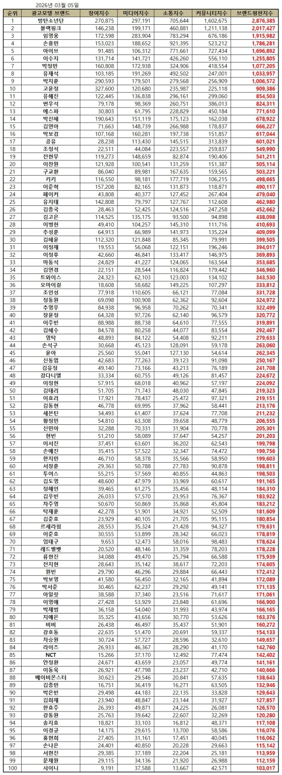2026年3月の広告モデルのブランド評判調査は、BTS、BLACKPINK、イム·ヨンウン、ソン·フンミン、アイブ、イ·スジ、パク·ジョンミン、ユ·ジェソク、パク·ジフン,コ·ユンジョン,ユ·ヘジン,ビョンウソク,エスパ,パク.シネ,パク.ボゴム,コンユ,チョ.ジョンソク,チョン.ヒョンム,イ.チャンウォン,キキ,イ.ジュヒョク,フェイカー,ユ.ジテ,キム.ジョングク,キム•ゴウン(김헌인성, 이병) 、イ·ビョンホン(,성훈성성동원진) 、キム·ヘユン(이정재(이정부) 、キム•영 タク·ジェフン、キム·ジュンホ、ルセラフィム、イ·ジュンホ、オム·テグ、レッドベルベット、リュ·ヒョンジン、チョン·ジヒョン、ウォンビン,パク·ボヨン,パク·ソジュン,アイレット,イヨンエ,パク·ジェボム,チ·イェウン,ビビ,カン·ホドン,チャ·スンウォン,ライズ,NCT,安貞桓,李ドンウク,ベビーモンスター,金ジョンミン,朴銀彬、金熙在(パク·ヒジェ)、韓孝柱(ハン·ヒョジュ)、宋ジヒョ、李景奎(ソン·ギョンギュ)、洪賢姫(ホン·ヒョンヒ)、ソン·ナウン)、徐賢鎮(ソヒョンジン)、文采元。