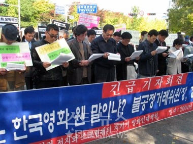 <사진=지난해 10월21일 과천 정부종합청사 앞에서 공정위의 '스크린쿼터제가 질낮은 영화를 양산한다'는 주장에 대해 항의 시위를 하는 영화인대책위.>