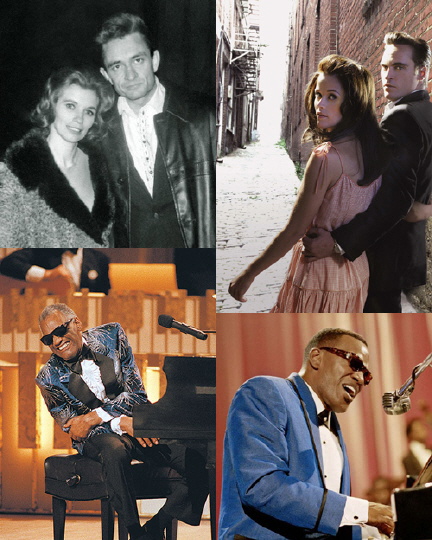<사진1=실제 자니 캐쉬와 준 카터(위 왼쪽), '앙코르'의 호아킨 피닉스와 리즈 위더스푼(위 오른쪽). 실제 레이 찰스(아래 왼쪽), '레이'의 제이미 폭스(아래 오른쪽)>