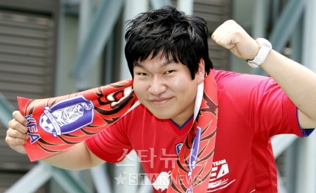 <사진설명=박효준은 같은 동작이라도 표정과 의상 만으로 전혀 다른 인상을 풍긴다. 영화 속 이미지를 닮은 사진(위)과 태극 전사를 응원하는 사진을 비교하면 바로 느낄 수 있다. 구혜정 기자 photonine@>