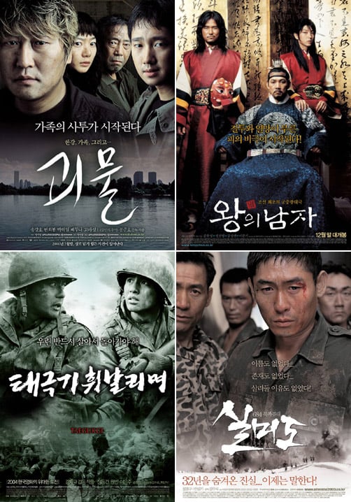 사진 왼쪽 위부터 시계방향으로 '괴물', '왕의 남자', '실미도', '태극기 휘날리며'