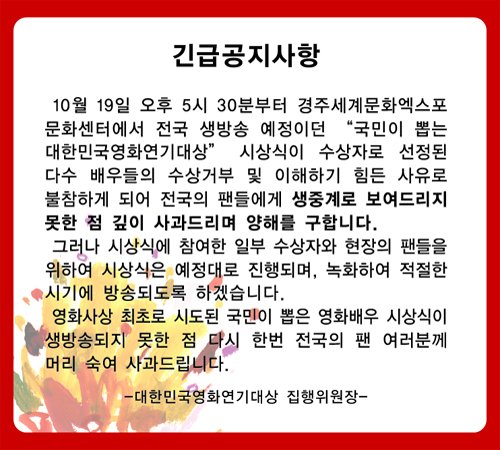 수상자들의 대거 불참과 생방송 전격 취소 등으로 대한민국 영화연기대상은 시작부터 몸살을 앓았다.