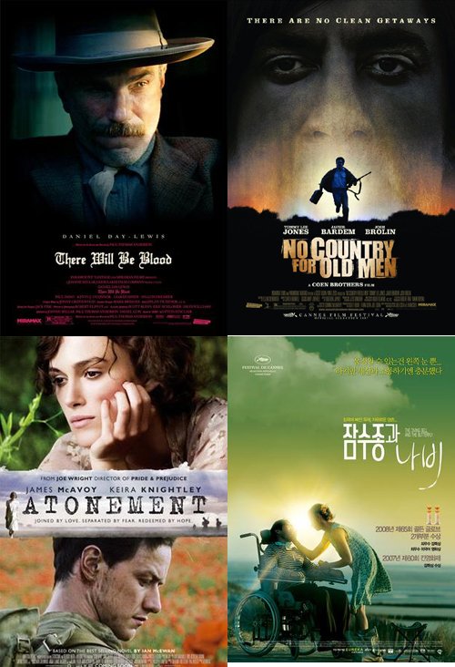 역시 작품상, 감독상, 각본상, 남우조연상, 촬영상, 편집상, 음향상, 음향편집상 등 8개 부문 후보로 '데어 윌 비 블러드'와 동률을 기록한'노인을 위한 나라는 없다'는 2월21일 개봉한다. 200만 달러가 든 가방을 주은 모스(조쉬 브롤린)와 이를 좇는 살인마 안톤 시거(하비에르 바르뎀), 보안관 벨(토미 리 존스)가 벌이는 혼돈과 폭력을 그렸다.