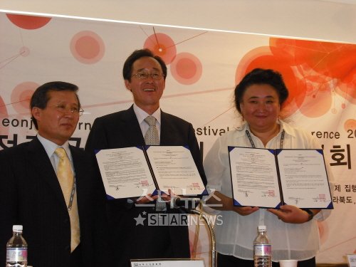 2일 오후2시 전북 전주시 영화의 거리 내 쌈지 매장 2층 공식기자회견장에서 송하진 조직위원장과 민병록 집행위원장, 굴라나 아비케예바 유라시아국제영화제 아트 디렉터가 참석해 양 영화제간의 MOU를 체결했다.