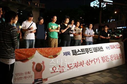 연예영화[★포토]영화인, '삼키기 힘든 진실'발행 : 2008.07.03 ・ 21:18임성균 기자정윤철 영화감독과 영화인들이 3일 저녁 서울 코엑스 메가박스에서 영화 '패스트푸드 네이션'을 관람한 후 아셈광장에 모여 촛불을 밝히고 있다.<저작권자 © 스타뉴스, 무단전재 및 재배포 금지>패스트푸드네이션추천 기사좋아요 연예-영화의 인기 급상승 뉴스연예-영화의 최신 뉴스