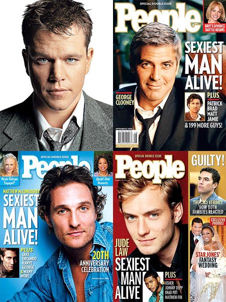 미국 대중 연예지 피플은 매년 현존하는 가장 섹시한 남자를 발표해왔다. 2007년에는 맷 데이먼(38), 2006년에는 조지 클루니(47) 2005년 매튜 매커너히(39) 2004년에는 주드 로(36)가 선정됐다.