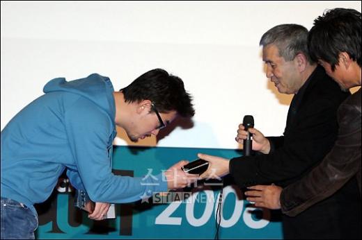 임권택 감독이 16일 오후 서울 압구정 CGV에서 열린 '제11회 디렉터스컷 시상식'에서 영화 '추격자'로 신인감독상을 수상한 나홍진 감독에게 뷰파인더를 선물하고 있다.