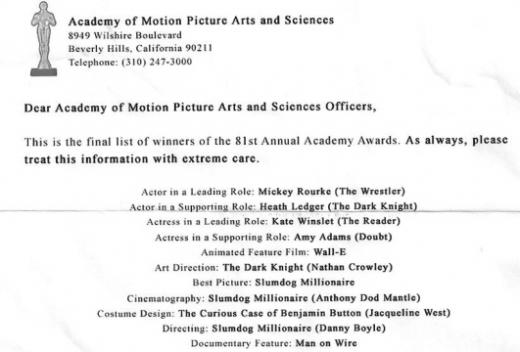 그러나 22일(현지시간) 시상식 결과, 이 괴문서가 수상결과를 맞힌 것은 총 24개 부문상 중에서 고작 '9개'에 불과했다. 그나마 맞힌 것도 최우수작품상(슬럼독 밀리어네어), 여우주연상(케이트 윈슬렛), 남우조연상(고 히스 레저), 다큐멘터리상(맨 온 와이어) 등 거의 누구나 예상했던 상들에 불과했다.