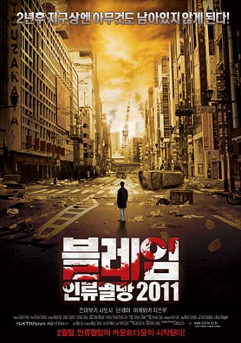 올 초 선보인 일본영화 '블레임: 인류멸망 2011'(감독 제제 타카히사, 2009)이 대표적이다. 이 영화는 모든 인류를 위협하는 신종 바이러스의 대재앙을 다뤘다. 고열증세로 입원한 환자가 갑자기 사망하는 등 일본 도쿄 곳곳에서 이와 비슷한 상황이 속출하면서 일본은 물론 전 세계가 혼란에 빠진다는 내용이다.