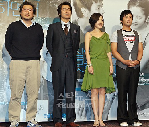 홍상수 감독, 배우 김태우, 엄지원, 공형진이 27일 오후 서울 왕십리CGV에서 열린 영화 '잘 알지도 못하면서' 언론시사 및 기자간담회에 참석해 포즈를 취하고 있다.
