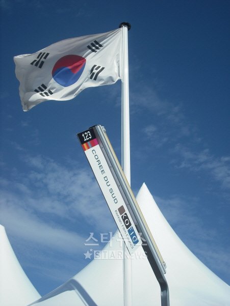 ⓒ칸해변에 위치한 한국영화진흥위원회 부스 앞에서 태극기가 바람에 힘차게 펄럭이고 있다.