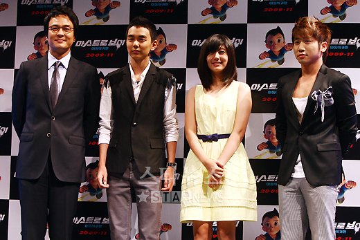 배우 조민기와 유승호, 남지현, 개그맨 유세윤이 18일 오전 서울 압구정 CGV에서 열린 영화 '아스트로 보이, 아톰의 귀환' 제작발표회에서 포토타임을 갖고 있다.