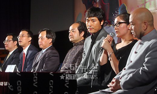 마오위 중국국가광파전영전시총국 정영국 부국장, 장야오밍 국무원 법제반 교육과학문화위생사 부사장, 죠우바오린 중국국가광파전영전시총국 전영국 영화시장관리처장, 양홍타오 닝시아 전영제편창 창장, 배우 정우성, 마리원 감독, 평 지아황 감독(사진 왼쪽부터)이 18일 오후 서울 용산CGV에서 열린 '2009 중국영화제' 기자회견에 참석하고 있다.