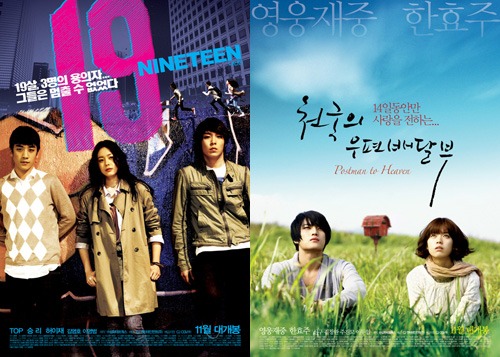 앞서 두 영화는 국내 톱 아이돌 그룹 멤버들의 스크린 진출작으로 화제를 모았다. 영웅재중은 '천국의 우편배달부'에서 천국으로 우편을 배달하는 배달부를, ''19-Nineteen'에서 탑은 소녀가 죽던 마지막 날 함께 있었던 대학생 정훈을, 승리는 그녀를 몰래 촬영한 소심한 재수생 민서를 연기했다.