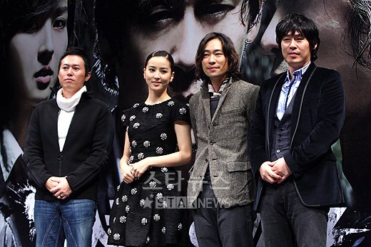 김형준 감독, 배우 한혜진. 류승범, 설경구(사진 왼쪽부터)가 2일 오전 서울 압구정 CGV에서 열린 영화 '용서는 없다' 제작발표회에 참석해 포즈를 취하고 있다.