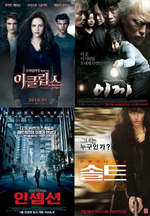 7월, 화려한 명성의 영화들이 스크린을 수놓는다. 전작 혹은 원작의 명성을 빌린 '이클립스'와 '이끼'부터, 감독과 배우에 대한 신뢰로 빛나는 '인셉션'과 '솔트'까지. 전작, 원작, 감독, 배우 등 허울 좋은 명찰일랑 잠시들 잊으시라. 어차피 짊어진 이름의 무게는 모두 만만치 않다. 올 여름 극장가에서 한바탕 전쟁을 벌일 영화들. 그 화려한 면면은 이렇다.