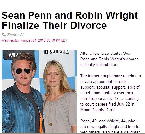 숀펜,로빈 라이트 펜과 11년 만 이혼