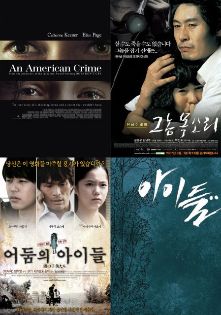 아동범죄 영화들 중 일부는 실제 있었던 사건을 그려 관객들의 마음을 후벼 판다. 유괴, 납치뿐 아니라 학대, 매춘에 이르기까지. 범죄에 노출된 어린이들의 비극은 실화라서 더욱 더 시리게 다가온다. 아동범죄를 그린 실화 영화들. 그 잔혹한 내용들은 다음과 같다.