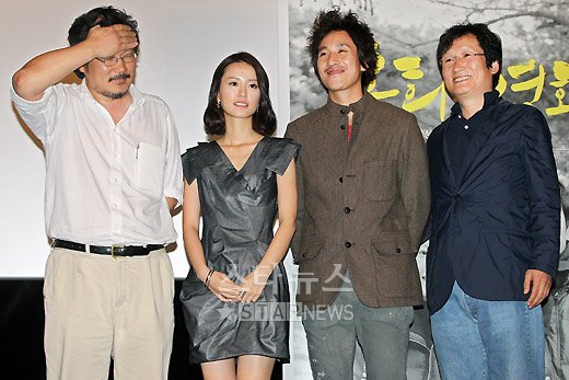 홍상수 감독, 배우 정유미, 이선균, 문성근(사진 왼쪽부터)이 13일 오후 서울 왕십리 CGV에서 열린 영화 '옥희의 영화' 언론시사 및 기자간담회에 참석해 포즈를 취하고 있다.