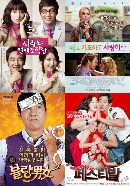 올 가을 한동안 자취를 감췄던 로맨틱 코미디 물의 약진이 눈부시다. 상처뿐일지언정 추석 영화 왕좌를 차지한 '시라노; 연애조작단'과 줄리아 로버츠의 '먹고 기도하고 사랑하라'가 바로 그 주인공들. 통속코미디 '방가? 방가!'에도 남녀주인공의 로맨스 코드가 숨어있다.