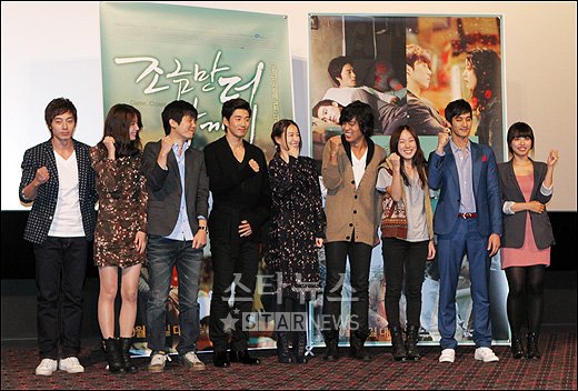 18일 오후 서울 왕십리 CGV에서 열린 영화 '조금만 더 가까이' 시사회에서 감독과 주연배우들이 포즈를 취하고 있다.