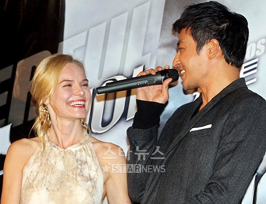 배우 케이트 보스워스와 장동건이 23일 오후 서울 영등포CGV에서 열린 영화 '워리어스 웨이' 월드프리미어 행사에 참석해 환하게 웃고 있다.
