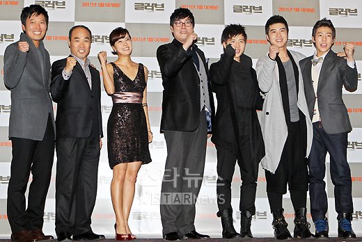 배우 정재영, 강신일, 유선, 조진웅, 김혜성, 장기범, 이현우(사진 왼쪽부터)가 10일 오후 서울 왕십리CGV에서 열린 영화 '글러브' 언론시사 및 기자간담회에 참석해 파이팅을 외치고 있다.
