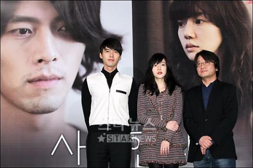 배우 현빈과 임수정, 이윤기 감독이 14일 오후 서울 왕십리 CGV에서 열린 영화 '사랑한다 사랑하지않는다' 언론시사회에 참석해 포즈를 취하고 있다.